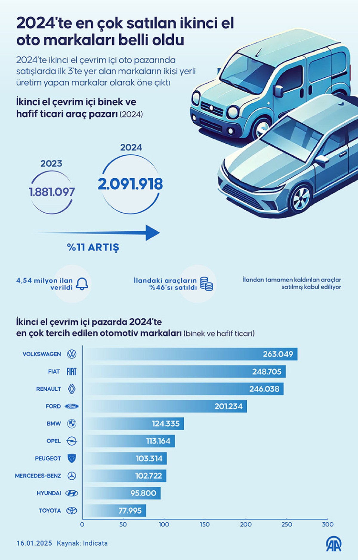 kinci el çevrim içi pazarda 2024’te en çok tercih edilen otomotiv markası (binek ve hafif ticari) 263 bin 49 satış ile Volkswagen oldu. Bunu, 248 bin 705 ile Fiat ve 246 bin 38 ile Renault takip etti.