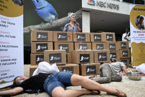 ABD medyasında İsrail’in Gazze’ye taarruzlarına ait haberlerin taraflı olmasını protesto eden göstericiler, “Soykırıma medyanın hata iştirakini durdurun.” ve “Medya palavra söylüyor, Gazze ölüyor.” yazılı dövizler taşıdı.