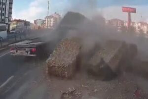 Balyaların savrulduğu anlar, öteki bir aracın kamerasına yansıdı.