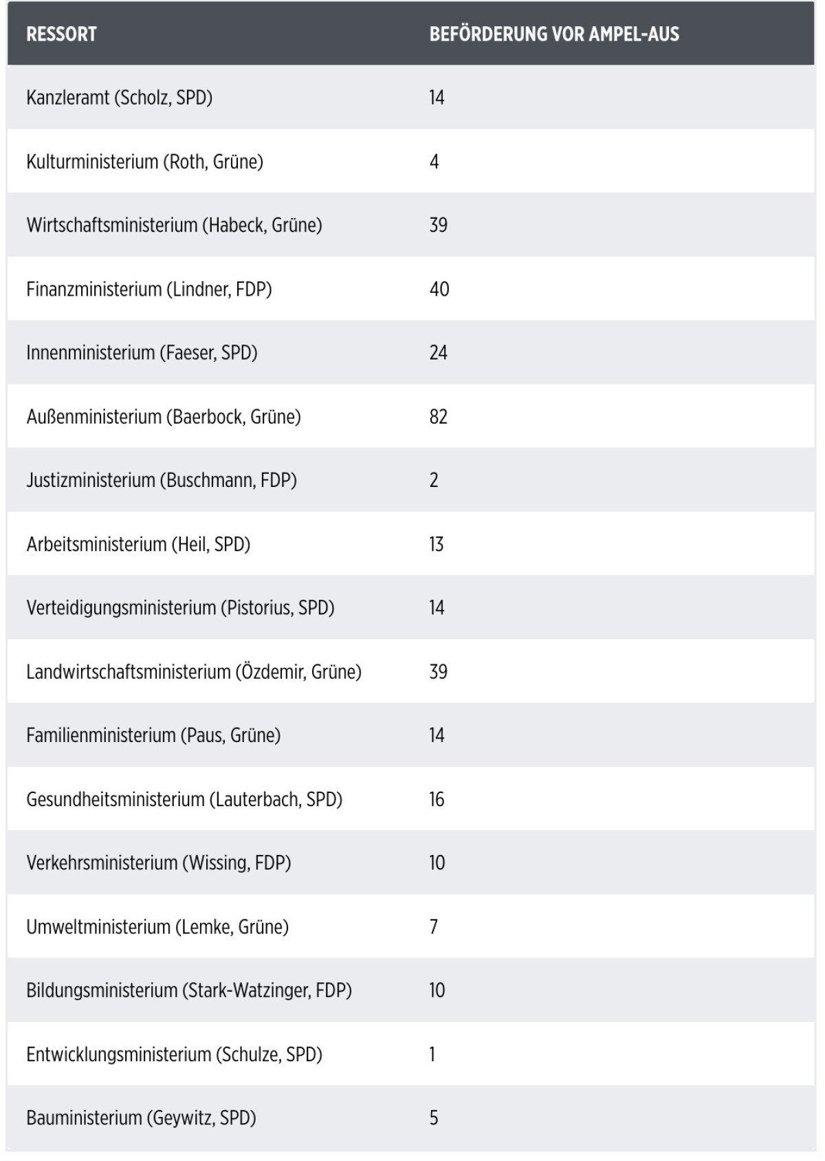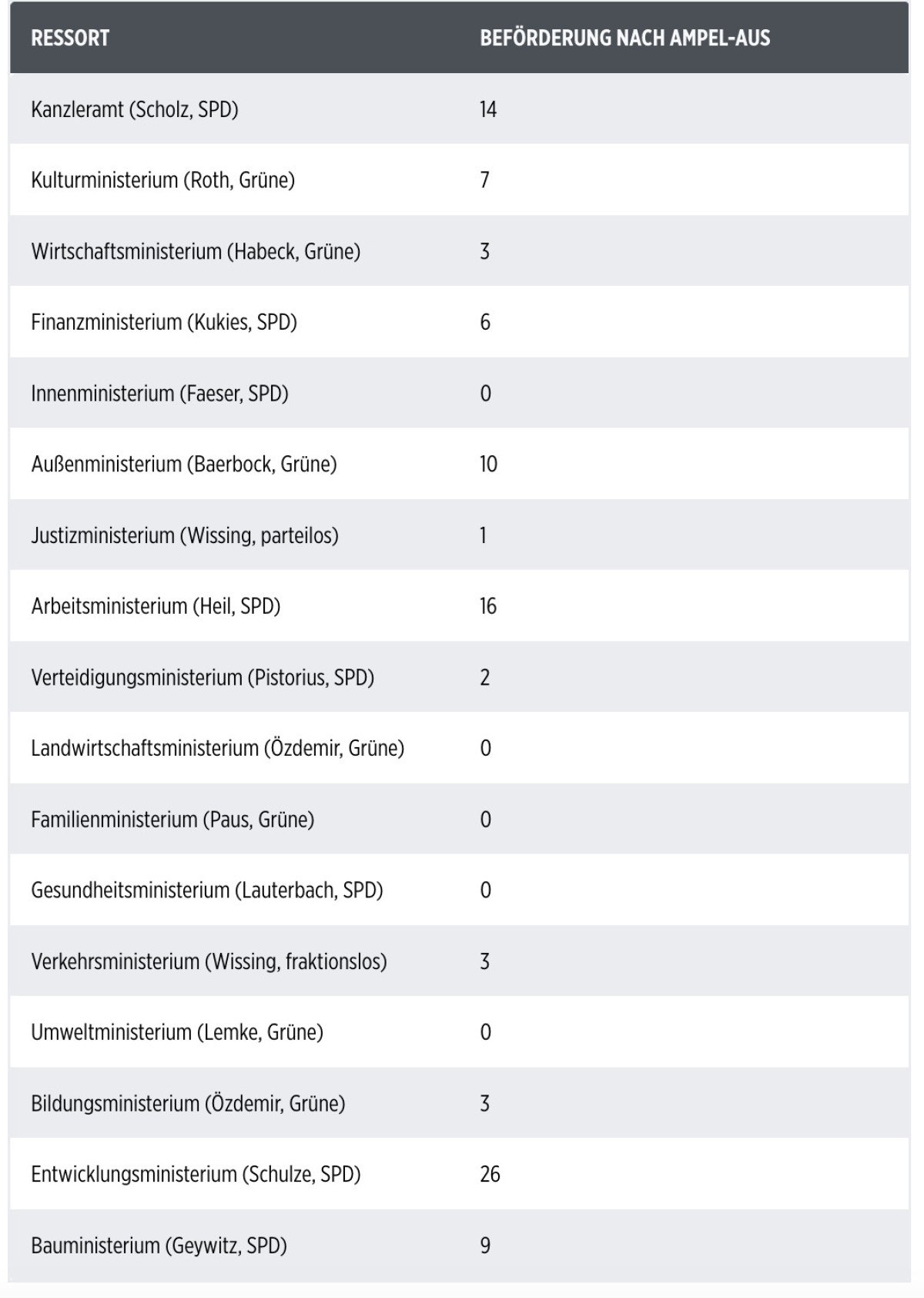 Toplamda, SPD ve Yeşiller, koalisyonun çöküşünden sonra sırf iki ayda tam 90 memurun maaş düzeyini yükseltti. Buna rağmen, yılın birinci 10 ayında (FDP’nin hükümette olduğu dönemde), tüm bakanlıkların toplamda sırf 337 memuru terfi ettirdiği açıklandı.