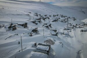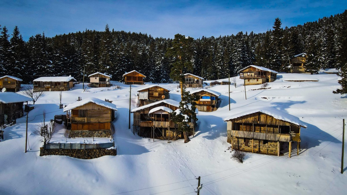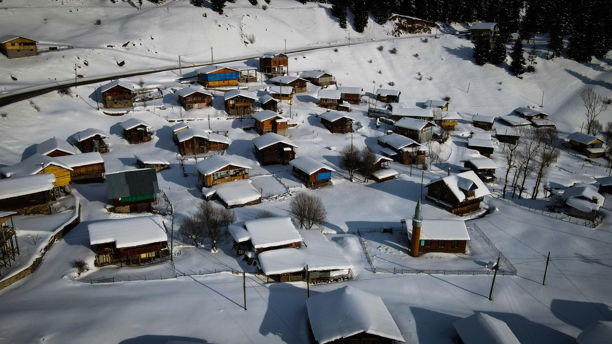 Doğal ve yaşlı ormanlar içinde yer alan ladin, sarıçam ve köknar ağaçlarının etrafına kurulan yayla meskenlerinin çatıları karla kaplanırken, karayolunda seyahat edenler durup, yol kenarından bol bol fotoğraf çekiyor.