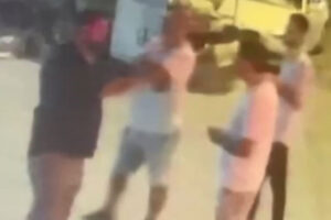 Defalarca Vural İşçen ve duraktaki öbür taksicilerin üzerine yürüyen S.G. bir mühlet sonra durağa gelen polis tarafından sakinleştirilip uzaklaştırılmaya çalışıyor.