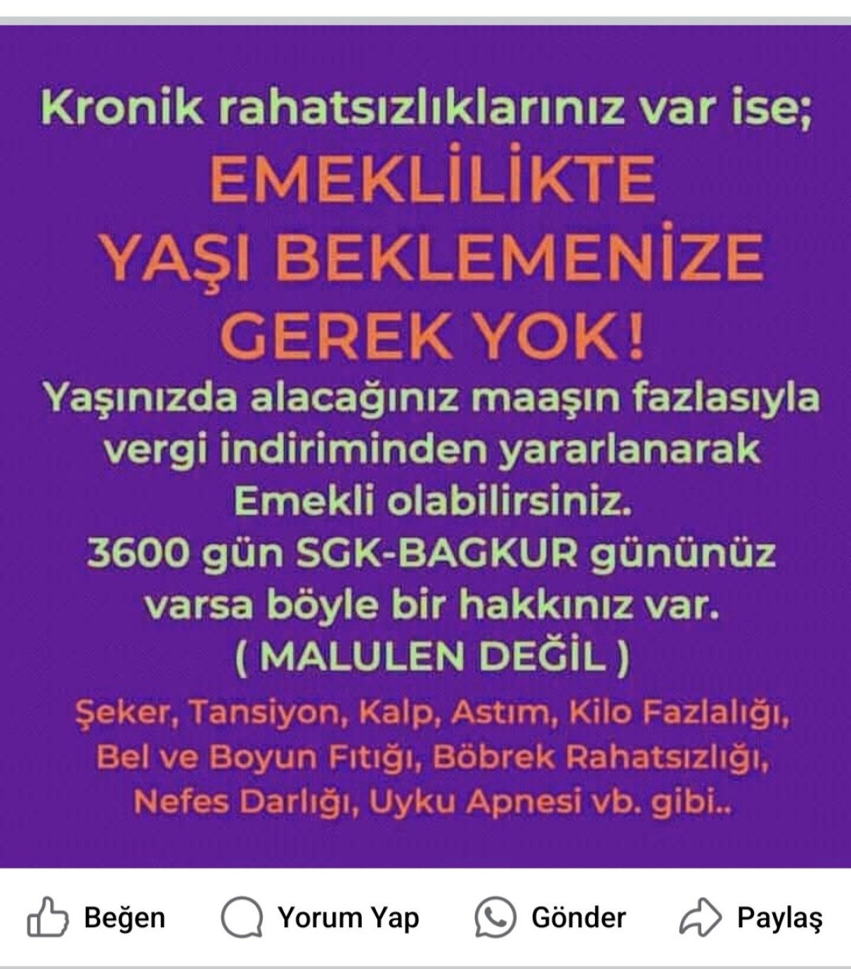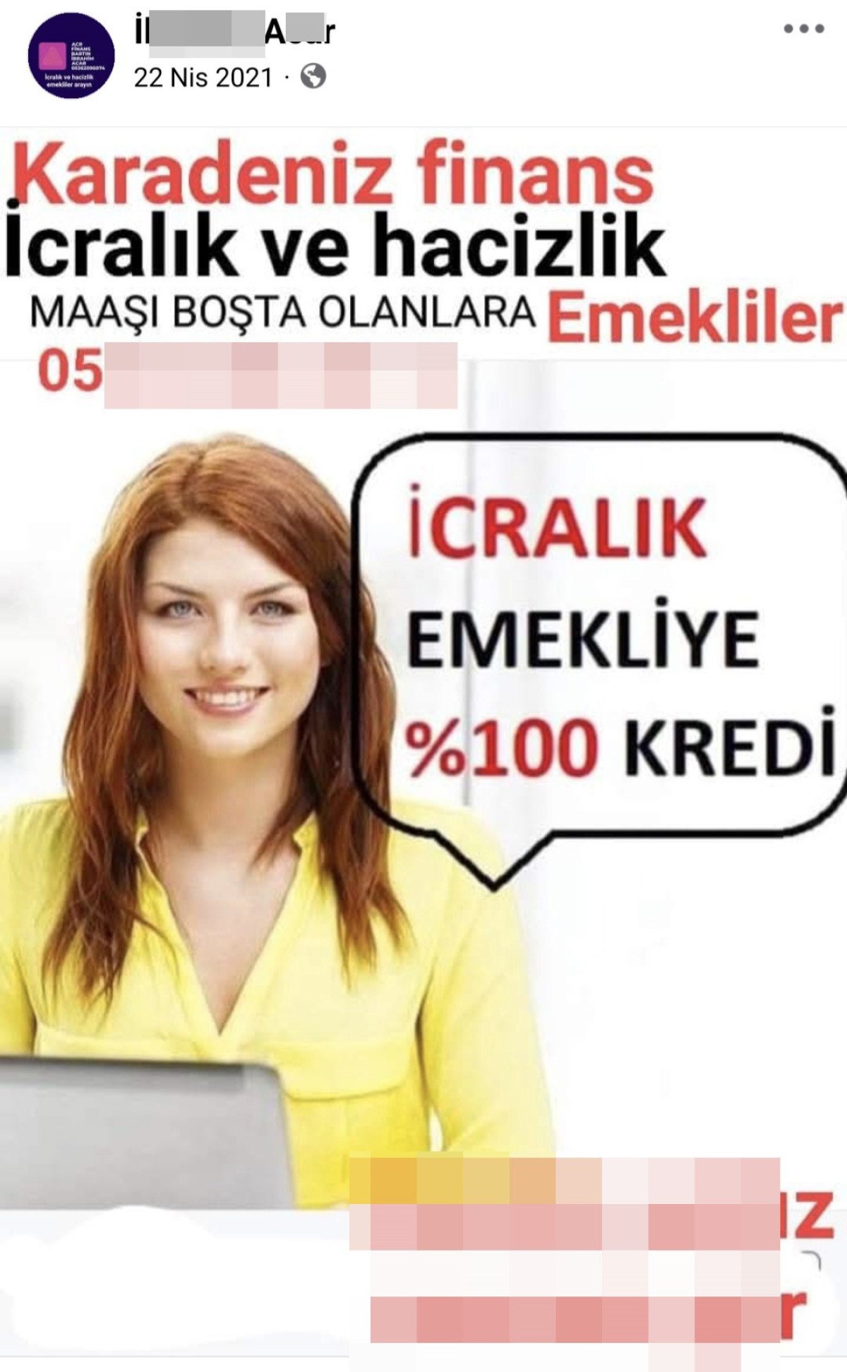 Sosyal medya aracılığıyla yapılan bir reklamda, “Maaşı boşta olanlara, icralık emekliye yüzde 100 kredi. İcralik ve hacizlik emekliler arayın. Kronik rahatsızlıklarınız var ise; emeklilikte yaşı beklemenize gerek yok. Yaşınızda alacağınız maaşın ziyadesiyle vergi indiriminden yararlanarak emekli olabilirsiniz. 3600 gün SGK-Bağ-Kur gününüz varsa bu türlü bir hakkınız var. (Malulen değil). Şeker, tansiyon, kalp, astım, kilo fazlalığı, bel ve boyun fıtığı, böbrek rahatsızlığı, nefes darlığı, uyku apnesi gibi” ifadeler yer alırken, bir diğer reklam paylaşımında ise, “Emeklilere birebir gün nakit takviye kredi. Emeklilere müjde. Maaşından eline kuruş dahi kalmayan, kredi limiti dolu olup kredi çekemeyen emekliler ve dul yetim maaşı alanlara birebir gün 5 bin ile 20 bin ortası nakit imkanı. Mutlaka ön ödeme talep etmiyoruz. Edenlere de prestij etmeyiniz. İcralık ve hacizlik emekliler arayın” sözleri dikkat çekti.