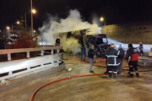 Bolu’da Anadolu Otoyolu’nun Bolu Dağı mevkiinde Ukrayna’dan Irak’a mangal kömürü taşıyan Zafer Polat idaresindeki tırın dorse temas kabloları bilinmeyen nedenle tutuştu.