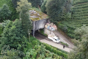 Beton direkler üzerine inşa edilen 10 metre uzunluğunda, 8 metre genişliğinde ve yoldan 5 metre yükseklikteki alım yerinin tabanına çay tahliyesi için delik bırakıldı.