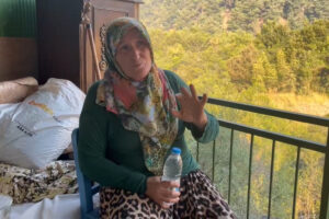 Tam bilmiyorum lakin 4,5-5 sırası buraya doruğa geldi. Oraya gelince aslında bir anda buraya geldi alevler. Eşimle birlikteydik, ondan sonra evlatlarımın hepsi geldi. Büyük oğlum çalışıyordu, o geldi yetişti, söndürmeye gittiler. Otomobilimiz oralarda kaldı, bir arkadaşa çektirdik. Allah’ım sönsün diğer hiçbir şey istemiyorum. Çok korktum. Birden harladı, yandı. Çocuklarım yanacak diye çok korktum.