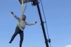 Damadın arkadaşları kiraladıkları vinç ile damadı iple sallandırdı.