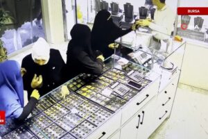 Bursa’da üç bayan bir çocuk, kuyumcuyu soydu ve süratle uzaklaşarak 2 milyon lirayı aşkın ziyan verdi. İkili hırsızlık imajlara yansıdı.