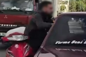 Görüntülerde, motorcunun arabanın camına yaslanarak bağırdığı ve içeriye uzanarak şoföre müdahale etmeye çalıştığı görüldü.