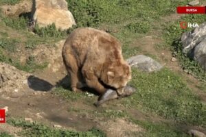 Bursa Hayvanat Bahçesinde bulunan boz ayılar, havaların mevsim normallerinin üzerinde seyretmesi sebebiyle kış uykusunu unuttu. 9 kiloluk levreği gören ayılar, paylaşmak istemese de taşıyamadığı için birini bırakmak zorunda kaldı.