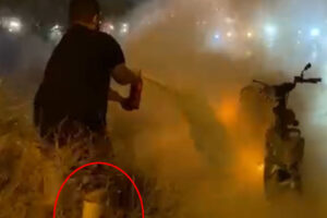Ayağında alçıyla motosiklete koşan vatandaş, elindeki yangın tüpüyle alevlere müdahale etti.