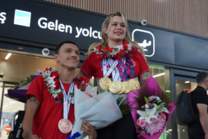 Singapur’dan İstanbul Havalimanı’na gelen ay-yıldızlı kafileyi Türkiye Yüzme Federasyonu yetkililerinin yanı sıra aileleri çiçeklerle karşıladı.