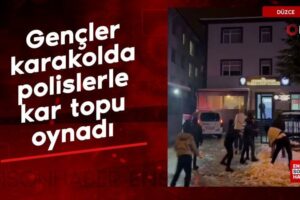 Düzce’de polislerle kar topu savaşı yapan gençler, bu sefer Cumayeri ilçe karakolundaki polislerle kartopu savaşı yapması dikkat çekerken, polislerin eğlenceli anlara eşlik etmesi yürekleri ısıttı.