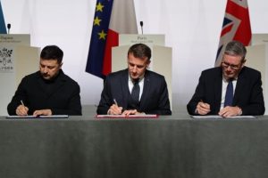 Ukrayna Devlet Başkanı Vladimir Zelensky, Fransa Cumhurbaşkanı Emmanuel Macron, İngiltere Başbakanı Keir Starmer, Ukrayna’ya barışın tesis edilmesi sonrasında çok uluslu güç konuşlandırılmasına ait niyet beyanına imza attı.