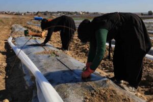 İşçilerin kimileri toprağı düzeltirken, kimileri fide çukurlarına gübre yerleştirdiği toprağı, fide ekimine hazır hale getirdi. Binbir emekle fideler toprakla buluşurken soğuktan korumak için üstlerini naylonla kapattı.