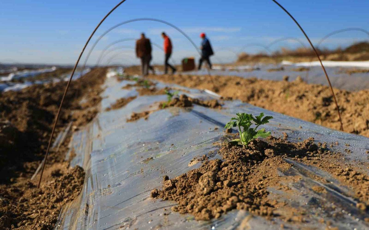Karataş ilçesinde karpuz fidelerinin toprakla buluşması görüntülendi.