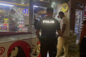 Alkollü şahıs camları kırdıktan sonra iş yerinde bulunan birtakım besin hususlarını yola fırlattı.
