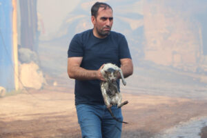Yangın sırasında komşu mahalle olan Yeşilyayla’dan yardıma gelen Muharrem Karahan, alevlerin sardığı bir konutta mahsur kalan kediyi fark etti.