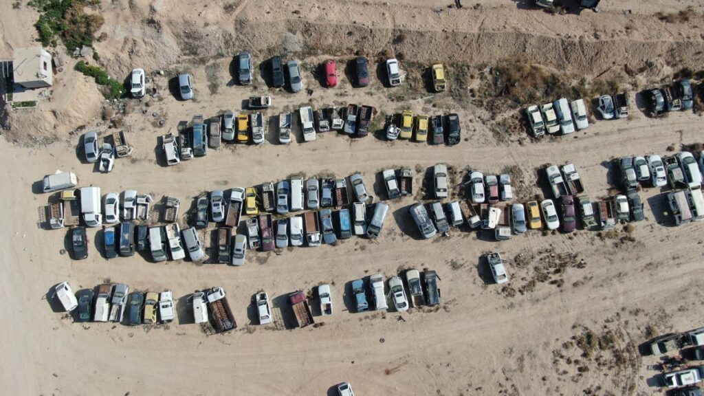 Binlerce araba, pikap, motosiklet ve kamyonetin bulunduğu garaj ise drone’la havadan görüntülendi.