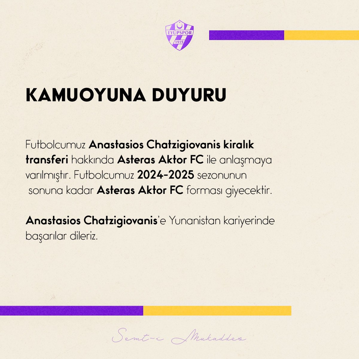Eyüpspor, futbolcu Anastasios Chatzigiovanis’i dönem sonuna kadar Yunanistan’ın Asteras Aktor grubuna kiraladı.