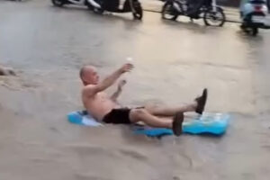 Ölüdeniz Mahallesi’nde ise turistler yollardan akan sularda tehlikeye aldırış etmeden eğlendi.