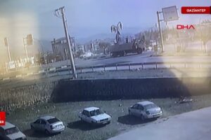 Gaziantep’in İslahiye ilçesinde TIR ile kamyonun çarpıştığı kazada araçtan düşen kesim, o sırada misyondaki zabıta memuru İkram Kuru’nun başına isabet etti. Armağan Kuru yaralanırken, kaza güvenlik kamerasına yansıdı.