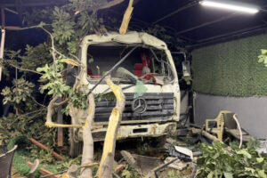 Hatay’ın Antakya ilçesi Narlıca Mahallesi’nde M.T. yönetimindeki kamyon, şoförünün direksiyon hakimiyetini kaybetmesiyle yaklaşık 8 metre uçarak restoranın bahçesine düştü.