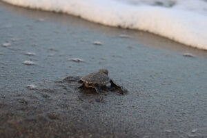 Hatay’ın Samandağ ilçesi kıyısında, yumurtalarından çıkan yeşil deniz kaplumbağası (Chelonia mydas) yavruları denizle buluştu.