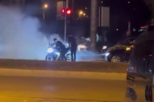 Motosikletli, lastik yakarak kısa müddette tozu dumana kattı.