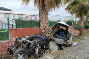 Hatay’ın Erzin ilçesi Bahçelievler Mahallesi’nde Kadir Fazilet idaresindeki araba, şoförünün denetimi yitirmesi sonucu yol kenarındaki iş yerinin duvarı ile palmiye ağacına çarptı.