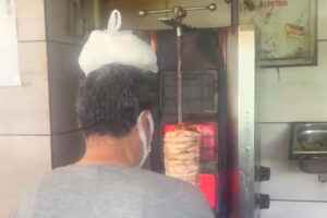 Hatay’da sıcaktan bunalan dönerci ustası kafasına buz torbası koydu