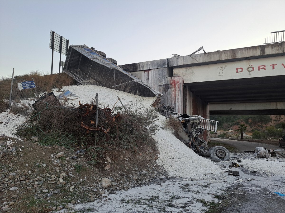 Hatay’da sürücü köprüden uçarak alev alan tırda mahsur kaldı