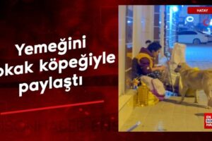 Hatay’ın İskenderun ilçesinde yediği yemeği sokak köpeğiyle paylaşan Ayşe Aslan’ın imajı yürekleri ısıttı.