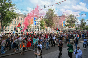 Bu kapsamda, Yüzlerce Filistin destekçisi, İsrail’in Gazze’deki akınlarını proteste etmek için Amsterdam’daki Borsa Meydanı’nı doldurdu.