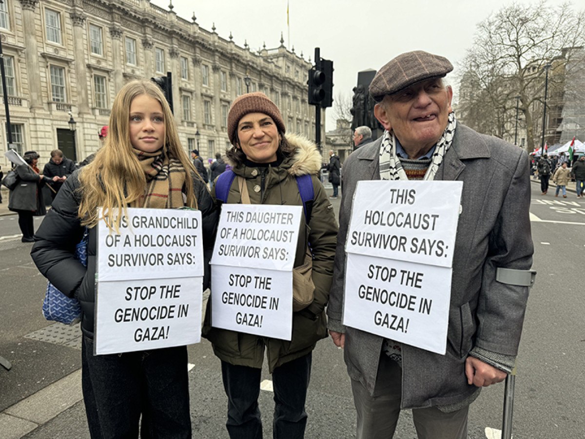 İngiltere’nin başşehri Londra’da 7 Ekim’den bu yana düzenlenen Filistin’e takviye yürüyüşlerine katılan Stephen Kapos, kızı Adrea ve torunu Isla Kapos, üzerlerinde “Gazze’de soykırımı durdurun” yazılı pankartlarla İsrail’in Gazze’ye yönelik taarruzlarına karşı seslerini yükseltiyor.