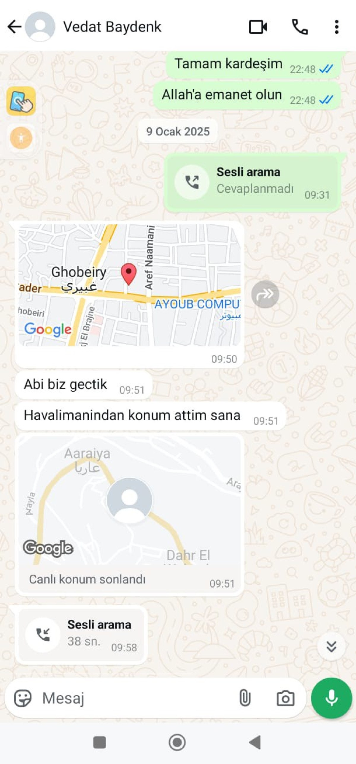 17 gündür kayıp. Bir firmadan iş almışlardı. Orada çalıştılar. Yüklü alacakları vardı. Bunlar da şikayet ediliyor. Onlar deport edilip Türkiye’ye gönderiliyor. 7 ay evvel oldu. Bunlar alacaklarını alamadığı için bu türlü tehlikeli bir yola girdiler. Dışişleri Bakanlığına gittik. Kederimizi anlattık. Konsolosluklarla bağlantı halindeyiz. Haber alamıyoruz. Şu an Lübnan sonundan kayıp. Daha kaçak olarak İsrail’e geçme durumu yoktu. Yalnızca hudutta yürüdükleri için o anda dron manzara alıyor akşam 18.00’de. 21.30’da irtibat kesiliyor. Sanki bunlar takip edildi de İsrail güvenlik güçleri tarafından alındı mı? Bu türlü bir şeyle kendimizi avutuyoruz.