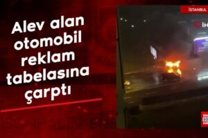 İstanbul Ataşehir’de alev alan otomobil reklam tabelasına çarptı