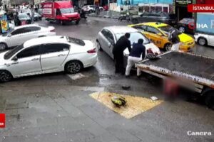 Pendik’te bir motokurye, trafikte tartıştığı şoföre ilişkin arabanın aynasını kırdı. Duruma sonlanan araç şoförü, arabasını motokuryenin üzerine sürdü. Çarpmanın tesiriyle sürüklenerek araba ile park halindeki çekicinin ortasında ezilen motokurye yaralandı. O anlar güvenlik kamerasına yansıdı.