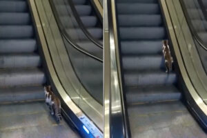 Kedinin yürüyen merdivenle çabasına şahit olanlar kendilerini izlemekten alıkoyamadı.