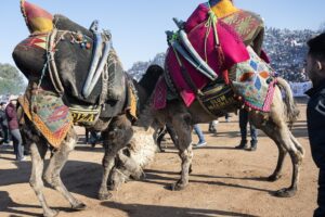 Deve güreşi etkinliğinde yalnızca develeri değil iştirakçilerin da klasik kıyafetler giydiği görülüyor.