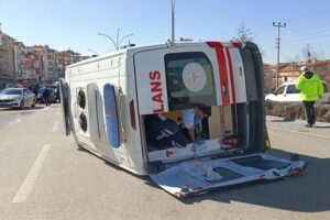 Karaman’da hasta taşıyan ambulans, kavşakta arabayla çarpışınca devrildi.