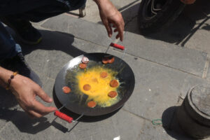 Güneşin tesiriyle dakikalar içinde pişen sucuklu yumurta, servise hazır hale geldi.