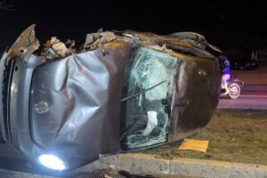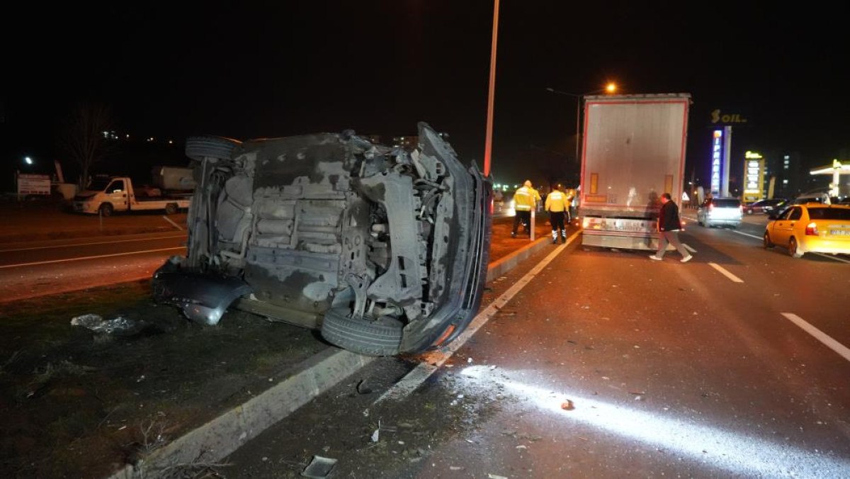 Çarpışmanın tesiriyle savrulan araba refüje devrildi.