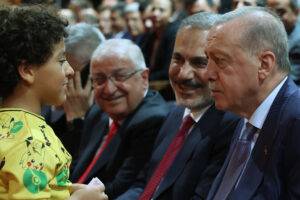 Minik çocuk, Cumhurbaşkanı Erdoğan’la yaşadığı anı, “Onu çok seviyoruz. ‘Erdoğan dede sana sarılabilir miyim?’ dedim, ‘Tabii’ dedi. Ben de yanacıklarından öptüm.” sözleriyle anlattı.