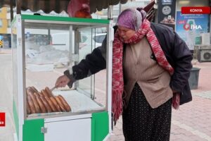 Konya’da eşinin kaza geçirmesinin akabinde konutun geçimine katkı için meskeninin önündeki cadde üzerine simit tezgahı açarak hem komşularının hem de müşterilerinin ‘simitçi teyzesi’ olan 58 yaşındaki Menekşe Demirkaya, her gün sabah erken saatlerde tezgahında simit satıyor.