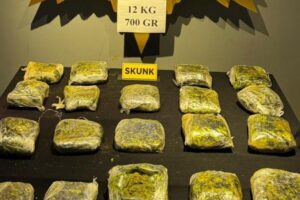Narkotik köpeğinin de yer aldığı kapsamlı aramalarda peynir bidonlarının içerisine gizlenmiş 12 kilo 700 gram skunk hususu ele geçirildi.