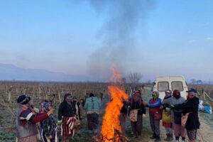 10’ar yahut 20’şer kişilik kümeler halinde çalışan bayanlar, işe başlamadan evvel bağlardan topladıkları çubukları bir ortaya getirip yakıyor.