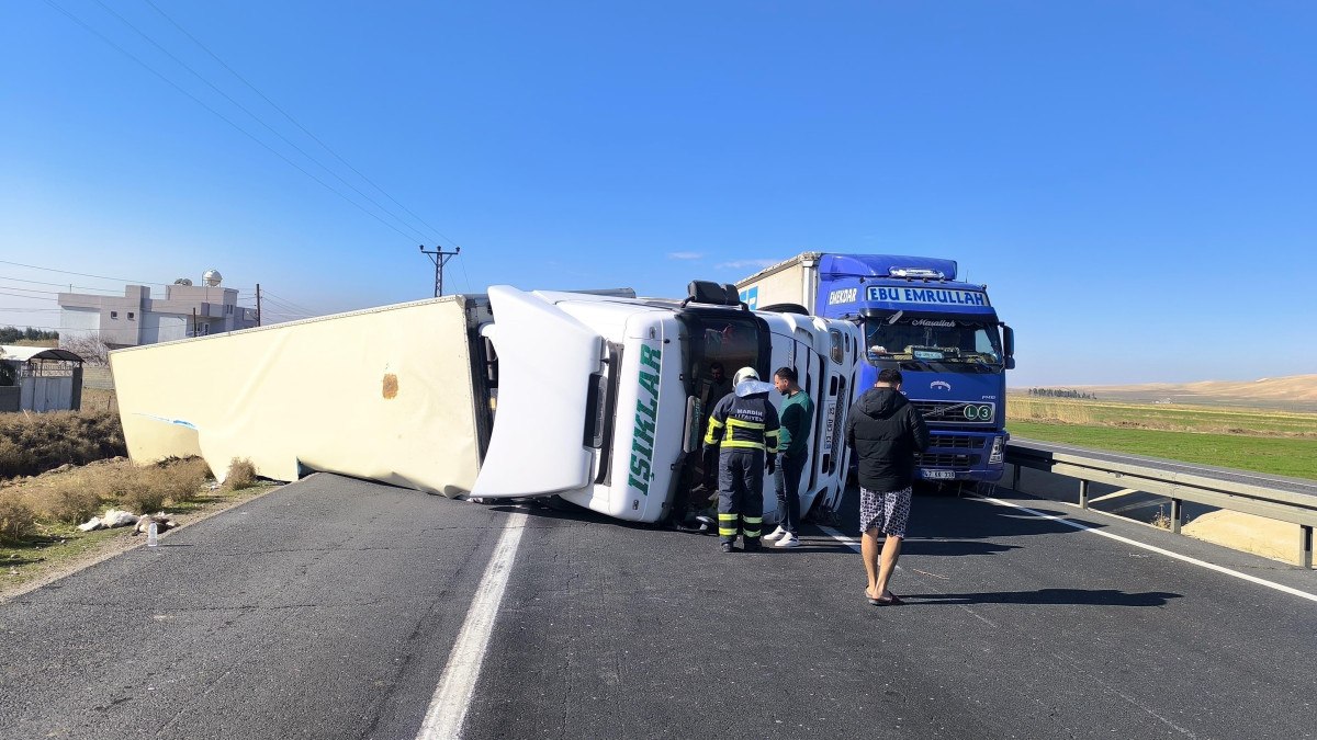 Mardin’in Nusaybin ilçesi Yolbilen Mahallesi’nde şoförünün direksiyon hakimiyetini kaybetmesi sonucu peynir yüklü tır devrildi.