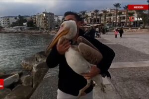 Mersin’in Silifke ilçesi Taşucu iskelesinde bir pelikan, vatandaşların şaşkın bakışları ortasında özgürce dolaşarak bölge halkının maskotu haline geldi.