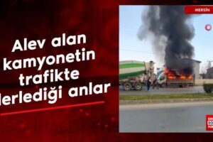 Mersin’de kasası alev alan kamyoneti şoförü trafikte seyrine devam etti. Alevleri fark eden şoför yol kenarında dururken yangını yoldan geçen beton mikserindeki suyla söndürüldü. Yanan aracın trafikte ilerlemeye devam ettiği anlar ise cep telefonu kamerasına yansıdı.